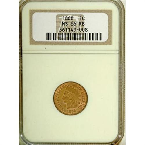 <B>1868 1C MS66 Red and Brown NGC.</B></I> Well struck by the standards of the issue with luminous salmon, mushroom-brown, and olive surfaces. An attractive Premium Gem survivor, tied for the finest Red and Brown example graded by NGC or PCGS (12/07).<BR><BR><B>Coin Engraver:</B> James B. Longacre<BR><BR><b>Shipping:</b> Coins & Currency (<a target="_blank" href="http://www.heritageauctions.com/common/shipping.php">view shipping information</a>)