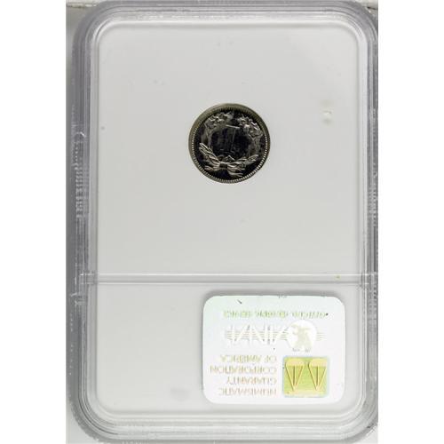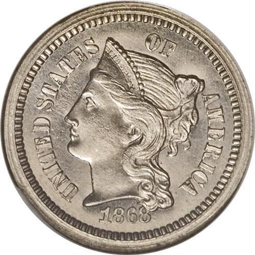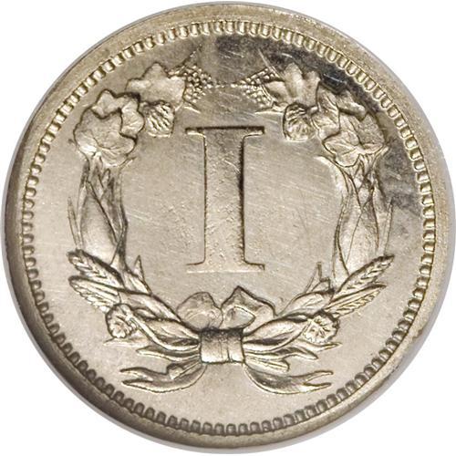 <B>1868 1C One Cent, Judd-605, Pollock-670, R.5, PR64 NGC.</B></I> The obverse is similar to the adopted three cent nickel design, and a reverse with a large Roman numeral I in the center surrounded by a wreath. Struck in nickel with a plain edge. The obverse of this brilliant, near-Gem specimen is noticeably striated and just a few wispy field marks to the right of the numeral on the reverse limit the grade.<BR><BR><b>Shipping:</b> Coin/Currency (<a target="_blank" href="http://www.heritageauctions.com/common/shipping.php">view shipping information</a>)