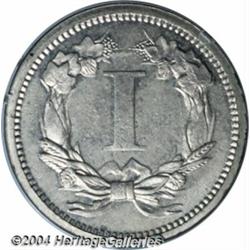<table><tr><td><table><tr><td>1868 1C One Cent, Judd-605, Pollock-670, R.5, PR64 PCGS. Diminutive pattern cent with an obverse similar to the adopted three cent nickel design, and a reverse with a large Roman numeral I in the center surrounded by a wreath. Struck in nickel with a plain edge. These are relatively common patterns that were issued in sets along with the three cent and five cent patterns of the same design. This particular example has only slight reflectivity in the fields and an overlay of light gray patina on each side. <BR><BR><B>Important notice:</B> Heritage usually auctions material at the rate of 200-250 lots per hour. On some occasions eBay Live bid software or the Internet may not be able to keep up with the pace of the auction. We recommend placing a realistic absentee bid now as insurance to avoid disappointment. Occasionally the auctioneer may eliminate or reject an eBay Live bid, and the auctioneer may also reopen a lot after the close of the eBay live bidding (usually because we missed an audience bid), and may reject your bid even if it shows you as the winning bidder. By bidding via eBay Live, you agree that Heritage may award the lot to another bidder at its sole discretion under the circumstances described above or any other reasonable circumstances. Since eBay bids are not shown to us until we open the lot on the floor, we treat those bids just like floor bids. In most cases the floor responds before the eBay bid is presented to us, due to Internet lag time, so for consistency we have made it a policy that floor bids are always considered first over tie eBay live bids. Also please note that all Heritage lots purchased through eBay Live carry a 20% Buyer's Premium. Please make sure you read the Terms and Conditions before you bid. <BR><BR><B>IMPORTANT ANNOUNCEMENT ABOUT RESERVES:</B> Heritage now divulges all reserves on its web site 7 days before every auction. If you want to know whether the reserve on this lot has been met, and if not, what the reserve amount is, please visit this lot page on the HeritageCoin.com web site, or email: bid@HeritageGalleries.com </span></font></td></tr></table></td></tr></table>