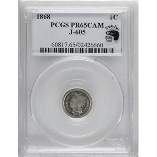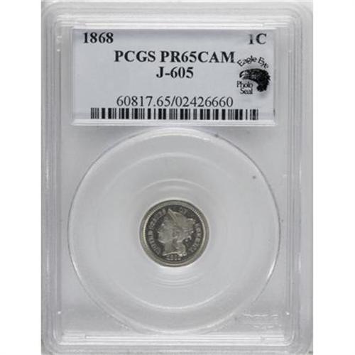 <B>1868 1C One Cent, Judd-605, Pollock-670, R.5, PR65 Cameo PCGS.</B></I> <B>1868 1C One Cent, Judd-605, Pollock-670, R.5, PR65 Cameo PCGS.</B></I> Diminutive pattern cent with an obverse similar to the adopted three cent nickel design, and a reverse with a large Roman numeral I in the center surrounded by a wreath. Part of the 8 in the date is buried in Liberty's lowest curl. Struck in nickel with a plain edge. An extraordinarily well preserved example of this popular pattern. Even though there is a slightly granular texture on each side, this does not hinder the bright reflectivity seen in the fields. The devices are noticeably frosted and provide a strong cameo contrast. At first one perceives this piece to be brilliant, but close examination reveals the presence of light streaky gray patina over each side.<BR><BR><b>Shipping:</b> Coins & Currency (<a target="_blank" href="http://www.heritageauctions.com/common/shipping.php">view shipping information</a>)