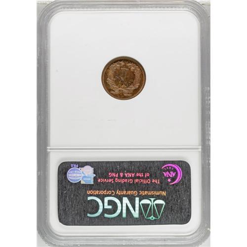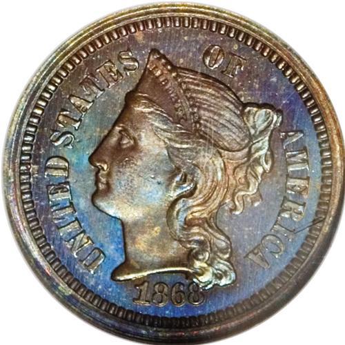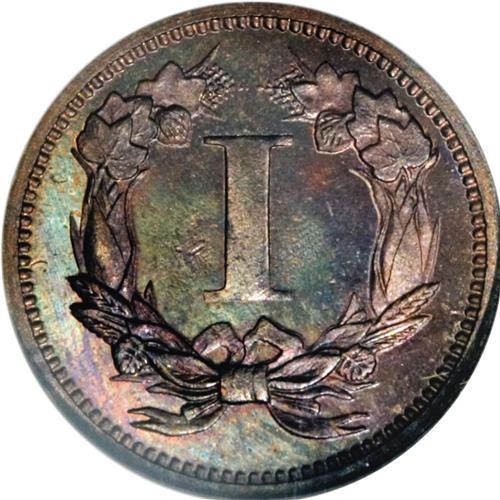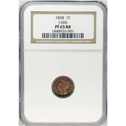 <B>1868 1C One Cent, Judd-606, Pollock-671, Low R.7, PR65 Red and Brown NGC.</B></I> This pattern cent has an obverse that is similar to the contemporary three cent nickel design, and a reverse with a large Roman numeral I in the center surrounded by a wreath. Struck in copper with a plain edge. The date is entered too high, and the second 8 is partly buried in Liberty's lower hair curls. Brightly mirrored in the fields with rich teal, sea-green, red, and brown patina. Softly struck in the center of the obverse and showing shallow roller marks on each side.<BR><BR><b>Shipping:</b> Coins & Currency (<a target="_blank" href="http://www.heritageauctions.com/common/shipping.php">view shipping information</a>)