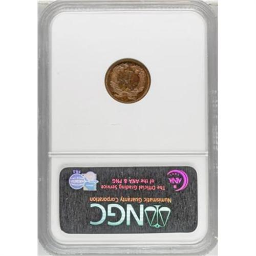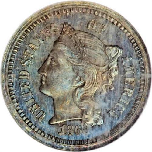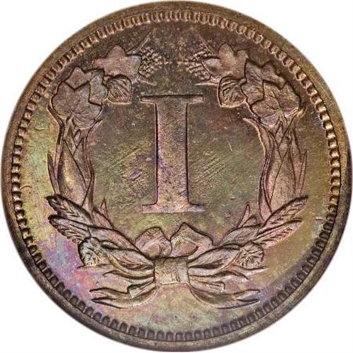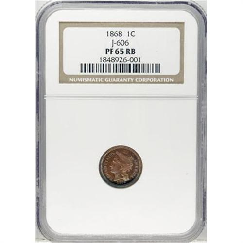 <B>1868 1C One Cent, Judd-606, Pollock-671, Low R.7, PR65 Red and Brown NGC.</B></I> This pattern cent has an obverse that is similar to the contemporary three cent nickel design, and a reverse with a large Roman numeral I in the center surrounded by a wreath. Struck in copper with a plain edge. The date is entered too high, and the second 8 is partly buried in Liberty's lower hair curls. Only a half dozen or so pieces are known. Brightly mirrored in the fields with rich teal, sea-green, red, and brown patina. Softly struck in the center of the obverse and showing shallow roller marks on each side.<BR><BR><b>Shipping:</b> Coins & Currency (<a target="_blank" href="http://www.heritageauctions.com/common/shipping.php">view shipping information</a>)