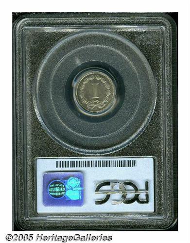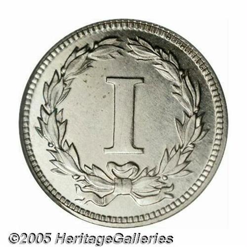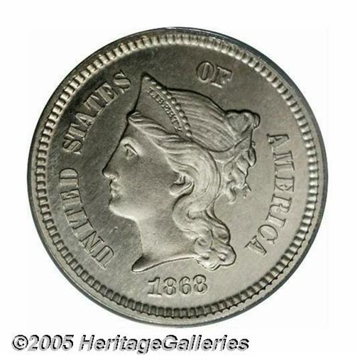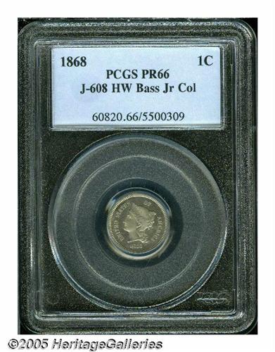<B>1868<1C> One Cent, Judd-608, Pollock-673, R.4, PR66 PCGS.</B></I> Bass Collection. The design closely resembles the contemporary three cent nickel, but only a single pillar represents the denomination within the wreath, and the ribbon ends are more prominent. Struck in nickel with a plain edge. Struck from Die Variety I, as listed by Harry Bass, who apparently discovered and collected all three variants. This particular coin is identifiable as Bass:1014 by a small planchet flake that is out of the field at the top left of the Roman numeral I. Deeply reflective fields with lovely pinkish-gray toning.<BR><I>Ex: J.M. Wade; 1971 ANA Sale (Stack's, 8/71), lot 311; Harry Bass, Jr.; Bass I (Bowers and Merena, 5/99), lot 1014.</B></I><BR><I>From The Western Hills Collection.</B></I>
