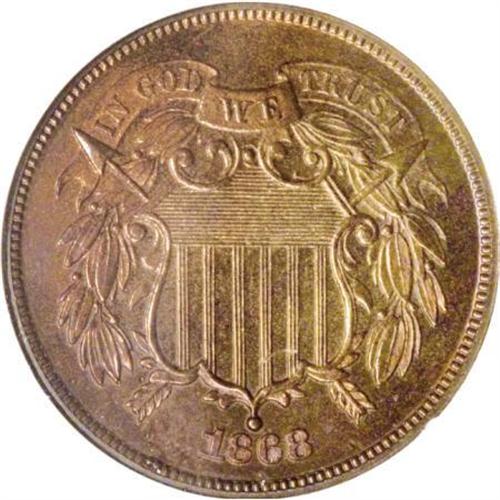 <B>Partial 1868 Proof Set PR61 to PR65 NGC.</B></I> The set includes:<BR><B>1868 Indian Cent PR64 Red NGC.</B></I> Struck with nearly medal turn, this well struck and unabraded cent has light orange-gold color and a few minuscule flyspecks.<BR><B>1868 Two Cent Piece PR65 Red and Brown NGC.</B></I> A beautiful, exactingly struck Gem with pleasing rose-red and pumpkin-gold toning. Mark-free, and carbon is practically nonexistent.<BR><B>1868 Three Cent Silver PR61 NGC.</B></I> A needle-sharp specimen with cream-gray patina and a few faint obverse field marks. The reverse is well preserved. A low mintage date.<BR><B>1868 Three Cent Nickel PR64 Cameo NGC.</B></I> A flashy near-Gem with light almond-gold toning and a precise strike. Minor carbon is all that limits the grade.<BR><B>1868 Three Cent Nickel Pattern, Judd-618, Pollock-687, R.4, PR63 NGC.</B></I> Similar to the issued design, but modifications include a lack of ribs on the Roman numerals. Struck in nickel with a plain edge. A boldly struck pearl-gray piece with a mildly granular charcoal-gray streak to the right of the wreath bow.<BR><B>1868 Shield Nickel PR64 NGC.</B></I> Caramel-gold and ice-blue tints visit the mark-free and flashy fields. A minor spot is noted near the N in UNITED. The date is lightly repunched.<BR><B>1868 Five Cent Pattern, Judd-633, Pollock-705, R.4, PR65 NGC.</B></I> The high date Pollock variant. The design is much like the issued three cent nickel, but Liberty has a star on her coronet, the Roman numeral V dominates the reverse, and the upper reverse has the motto IN GOD WE TRUST on a scroll topped by a Maltese cross. Struck in nickel with a plain edge. Lovely lemon-gold and cherry-red toning visits the unperturbed and suitably struck surfaces.<BR><B>1868 Seated Half Dime PR63 NGC.</B></I> Precisely struck and flashy with variegated olive-tan toning. Attractive for the grade. A low mintage date. Only 600 proofs were struck, the same reported mintage as the other non-patterns in the present set.<BR><B>1868 Seated Dime PR64 NGC.</B></I> An exquisitely struck specimen that boasts good reflectivity and unabraded surfaces. Peripheral charcoal-gold toning deepens on the reverse near 4 o'clock.<BR><B>1868 Seated Quarter PR64 NGC.</B></I> Fully struck and nicely mirrored with dappled gunmetal-gray and olive toning. Proofs and business strikes combined for only 30,000 pieces.<BR><B>1868 Seated Half Dollar PR64 Cameo NGC.</B></I> A precisely struck and nearly brilliant near-Gem with radiant devices and glassy fields. High quality for the certified grade.<BR><BR><B>Coin Engraver:</B> James B. Longacre<BR><BR><b>Shipping:</b> Coins & Currency (<a target="_blank" href="http://www.heritageauctions.com/common/shipping.php">view shipping information</a>)