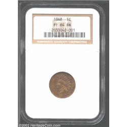 1868 1C PR64 Brown NGC. Attractive with original surfaces, the otherwise honey-brown features reveal dappled lavender and powder-blue undertones. Both sides are fully struck, the reverse is rotated nearly 180 degrees. Important notice: We expect to be auctioning lots at the rate of 200-250 per hour. Sometimes eBay Premier live bid software cannot keep up with that pace, so we strongly recommend that you place a realistic proxy bid now as insurance to avoid disappointment. Also please note that all Heritage/CAA lots purchased through eBay Premier carry a 20% Buyer's Premium. Please make sure you read the Terms and Conditions.