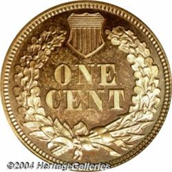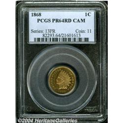<B>1868<1C> PR64 Cameo PCGS.</B></I> A flashy near-Gem, with highly reflective fields and a pronounced cameo contrast especially on the obverse. The color is full red, while faint die striations appear on each side. A slight contact mark is seen in the left obverse field, and there are a few small opaque toning spots are on the reverse. A very scarce proof issue with an estimated 600 pieces struck. Population: 1 in 64, 4 finer (7/04). <BR><BR><B>Important notice:</B> Heritage usually auctions material at the rate of 200-250 lots per hour. On some occasions eBay Live bid software or the Internet may not be able to keep up with the pace of the auction. We recommend placing a realistic absentee bid now as insurance to avoid disappointment. Occasionally the auctioneer may eliminate or reject an eBay Live bid, and the auctioneer may also reopen a lot after the close of the eBay live bidding (usually because we missed an audience bid), and may reject your bid even if it shows you as the winning bidder. By bidding via eBay Live, you agree that Heritage may award the lot to another bidder at its sole discretion under the circumstances described above or any other reasonable circumstances. Since eBay bids are not shown to us until we open the lot on the floor, we treat those bids just like floor bids. In most cases the floor responds before the eBay bid is presented to us, due to Internet lag time, so for consistency we have made it a policy that floor bids are always considered first over tie eBay live bids. Also please note that all Heritage lots purchased through eBay Live carry a 20% Buyer's Premium. Please make sure you read the Terms and Conditions before you bid. </span></font></tr></table></td></tr></table>