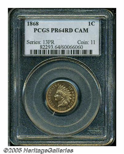 <B>1868<1C> PR64 Red Cameo PCGS.</B></I> Well struck with lovely orange-gold and tan colors, and watery, dramatically reflective fields. There are a few wispy slide marks near the center of each side, and a handful of small carbon spots are scattered over the obverse. The coin is rotated almost 180 degrees. Population: 2 in 64, 4 finer (5/05).