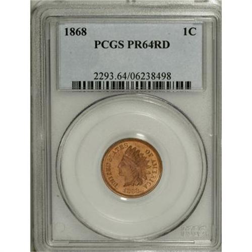 <B>1868 1C PR64 Red PCGS.</B></I> Fully struck and pristine, with reflective fields and lovely mint orange color on the devices. The dies are rotated nearly 180 degrees, as often seen on proofs of this date. A scarce, low mintage issue of 600 pieces. Population: 28 in 64 Red, 9 finer (6/07). <BR><BR><b>Shipping:</b> Coins & Currency (<a target="_blank" href="http://www.heritageauctions.com/common/shipping.php">view shipping information</a>)