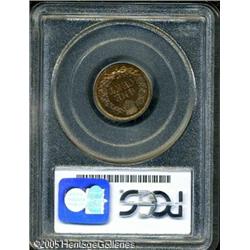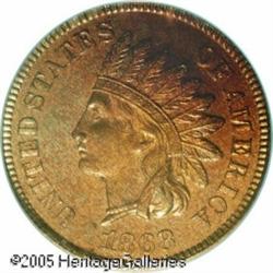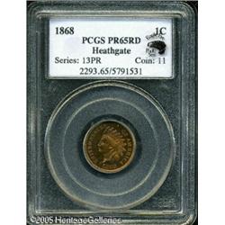 <B>1868 1C PR65 Red PCGS.</B></I> Ex: Heathgate. A razor-sharp Gem with vibrant orange-red and olive color. A pair of tiny toning flecks to the left of the 1 in the date do not distract. The dies are rotated 170 degrees clockwise (essentially medallic alignment). The traditional mintage of 600 pieces is likely close to correct, given the low certified populations. Of course, most surviving proofs no longer qualify as full Red. Population: 7 in 65, 2 finer (01/05).<BR><I>Ex: Benson Collection, Part One (Larry & Ira Goldberg, 2/2001), lot 1102, which realized $7,187.</B></I> Lot:5287