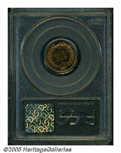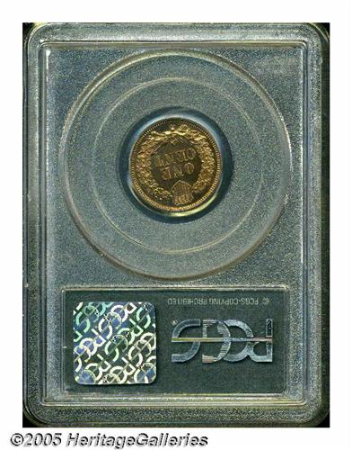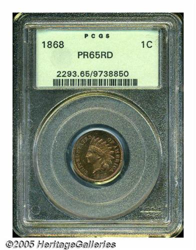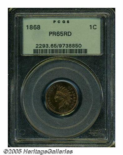 <B>1868<1C> PR65 Red PCGS.</B></I> Gold and cherry-red luster sparkles over both sides of this carefully preserved, Gem quality specimen. The design features are exquisitely struck. A small fleck in the left obverse field is not bothersome. The reverse is rotated nearly 180 degrees in relation to the obverse, a feature that is common to many of extant proof 1868 cents. Population: 7 in 65, 2 finer (3/05).