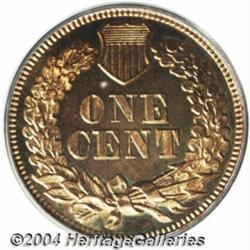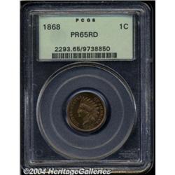 <B>1868<1C> PR65 Red PCGS.</B></I> Gold and cherry-red luster sparkles over both sides of this carefully preserved, Gem quality specimen. The design features are exquisitely struck. A small fleck in the left obverse field is not bothersome. The reverse is rotated nearly 180 degrees in relation to the obverse, a feature that Rick Snow says is common to about 10% of extant proof 1868 Cents. Population: 7 in 65, 2 finer (3/04). <BR><BR><B>Important notice:</B> Heritage usually auctions material at the rate of 200-250 lots per hour. On some occasions eBay Live bid software or the Internet may not be able to keep up with the pace of the auction. We recommend placing a realistic absentee bid now as insurance to avoid disappointment. Occasionally the auctioneer may eliminate or reject an eBay Live bid, and the auctioneer may also reopen a lot after the close of the eBay live bidding (usually because we missed an audience bid), and may reject your bid even if it shows you as the winning bidder. By bidding via eBay Live, you agree that Heritage may award the lot to another bidder at its sole discretion under the circumstances described above or any other reasonable circumstances. Since eBay bids are not shown to us until we open the lot on the floor, we treat those bids just like floor bids. In most cases the floor responds before the eBay bid is presented to us, due to Internet lag time, so for consistency we have made it a policy that floor bids are always considered first over tie eBay live bids. Also please note that all Heritage lots purchased through eBay Live carry a 20% Buyer's Premium. Please make sure you read the Terms and Conditions before you bid. </span></font></tr></table></td></tr></table>