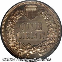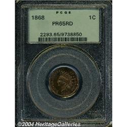 <B>1868<1C> PR65 Red PCGS.</B></I> Gold and cherry-red luster sparkles over both sides of this carefully preserved, Gem quality specimen. The design features are exquisitely struck. A small fleck in the left obverse field is not bothersome. The reverse is rotated nearly 180 degrees in relation to the obverse, a feature that is common to about 10% of extant proof 1868 Cents. Population: 7 in 65, 2 finer (9/04). <BR><BR><B>Important notice:</B> Heritage usually auctions material at the rate of 200-250 lots per hour. On some occasions eBay Live bid software or the Internet may not be able to keep up with the pace of the auction. We recommend placing a realistic absentee bid now as insurance to avoid disappointment. Occasionally the auctioneer may eliminate or reject an eBay Live bid, and the auctioneer may also reopen a lot after the close of the eBay live bidding (usually because we missed an audience bid), and may reject your bid even if it shows you as the winning bidder. By bidding via eBay Live, you agree that Heritage may award the lot to another bidder at its sole discretion under the circumstances described above or any other reasonable circumstances. Since eBay bids are not shown to us until we open the lot on the floor, we treat those bids just like floor bids. In most cases the floor responds before the eBay bid is presented to us, due to Internet lag time, so for consistency we have made it a policy that floor bids are always considered first over tie eBay live bids. Also please note that all Heritage lots purchased through eBay Live carry a 20% Buyer's Premium. Please make sure you read the Terms and Conditions before you bid.