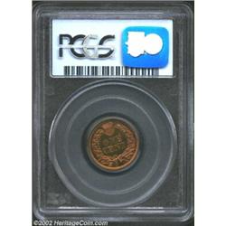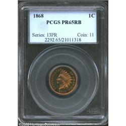 1868 1C PR65 Red and Brown PCGS. As with most proof 1868 Cents, this piece was struck from a rotated reverse die. The fields are deeply mirrored and give the coin a significant amount of flash. Each side has much original mint red with the addition of light purple patination that covers almost half of both the obverse and reverse. There really isn't any brown to speak of, and the coin basically presents as a full red piece.From the "Newmismatist" Collection; the All-Time #1 PCGS Registry Set. Important notice: We expect to be auctioning lots at the rate of 200-250 per hour. Sometimes eBay Premier live bid software cannot keep up with that pace, so we strongly recommend that you place a realistic proxy bid now as insurance to avoid disappointment. Also please note that all Heritage/CAA lots purchased through eBay Premier carry a 20% Buyer's Premium. Please make sure you read the Terms and Conditions.
