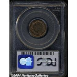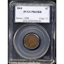<B>1868<1C> PR65 Red and Brown PCGS.</B></I> Scattered red, tan, and gold toning disguises the fields of this Red and Brown proof Indian cent. The reverse die is rotated about 175 degrees. Population: 34 in 65, 4 finer (3/04). <BR><BR><B>Important notice:</B> Heritage usually auctions material at the rate of 200-250 lots per hour. On some occasions eBay Live bid software or the Internet may not be able to keep up with the pace of the auction. We recommend placing a realistic absentee bid now as insurance to avoid disappointment. Occasionally the auctioneer may eliminate or reject an eBay Live bid, and the auctioneer may also reopen a lot after the close of the eBay live bidding (usually because we missed an audience bid), and may reject your bid even if it shows you as the winning bidder. By bidding via eBay Live, you agree that Heritage may award the lot to another bidder at its sole discretion under the circumstances described above or any other reasonable circumstances. Since eBay bids are not shown to us until we open the lot on the floor, we treat those bids just like floor bids. In most cases the floor responds before the eBay bid is presented to us, due to Internet lag time, so for consistency we have made it a policy that floor bids are always considered first over tie eBay live bids. Also please note that all Heritage lots purchased through eBay Live carry a 20% Buyer's Premium. Please make sure you read the Terms and Conditions before you bid. </span></font></tr></table></td></tr></table>