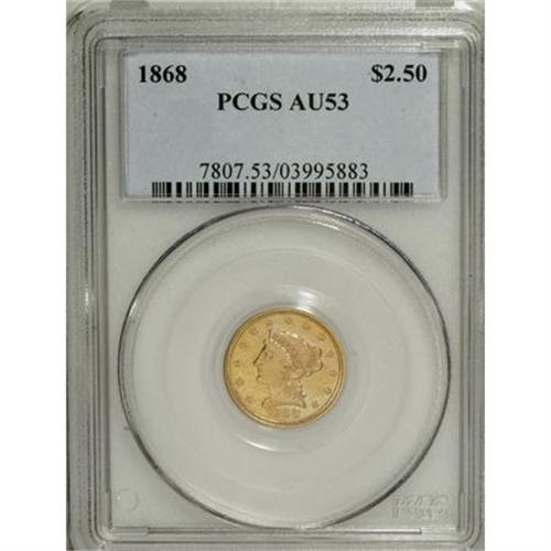 <B>1868 $2 1/2 AU53 PCGS.</B></I> PCGS Population (10/43). NGC Census: (10/96). Mintage: 3,625. Numismedia Wsl. Price for NGC/PCGS coin in AU53: $850. (#7807)<BR><BR><b>Shipping:</b> Coins & Currency (<a target="_blank" href="http://www.heritageauctions.com/common/shipping.php">view shipping information</a>)