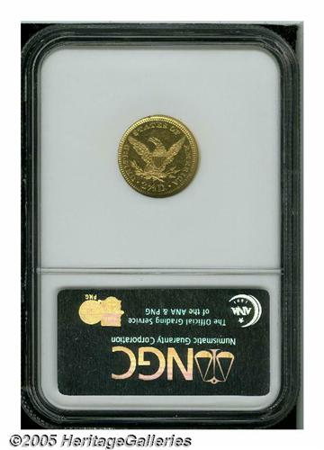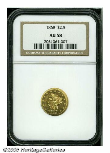 <B>1868<$2 1/2> AU58 NGC.</B></I> Boldly detailed with remnants of semi-prooflike reflectivity and mild scuffiness in the fields. Pleasing light coloration and the absence of obvious wear complete the picture of this near-Mint example. Just 3,600 pieces were minted, with most survivors in the XF40 to AU50 range. Population: 51 in 58, 20 finer (4/05).