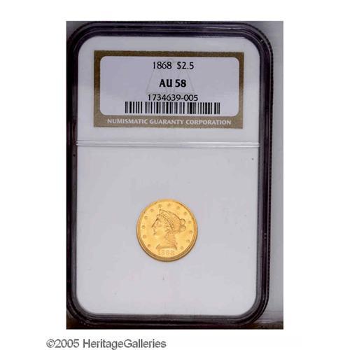 1868 $2 1/2 AU58 NGC. Considerable luster reposes in t 1868[$2 1/2] AU58 NGC.