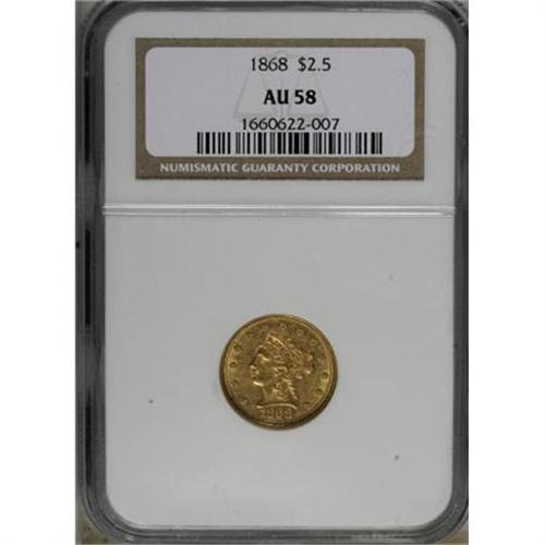 <B>1868 $2 1/2 AU58 NGC.</B></I> Just a hint of friction on the design elements keeps this attractive coin from a Select grade. The subtly lustrous, slightly hazy green-gold surfaces show elements of butter-yellow. Census: 69 in 58, 20 finer (2/08).<BR><BR><B>Coin Engraver:</B> Christian Gobrecht<BR><BR><b>Shipping:</b> Coins & Currency (<a target="_blank" href="http://www.heritageauctions.com/common/shipping.php">view shipping information</a>)