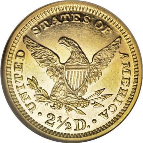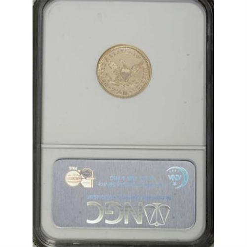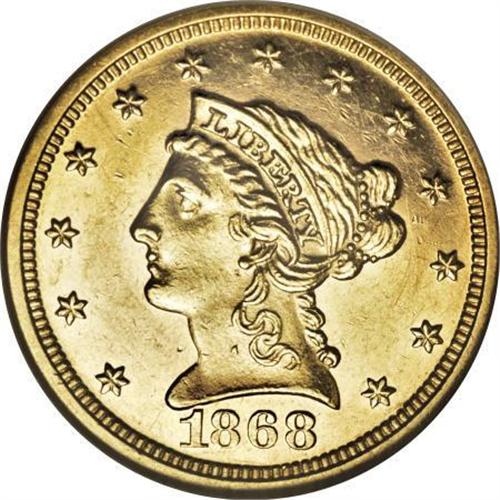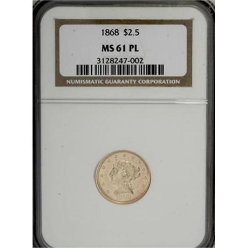 <B>1868 $2 1/2 MS61 Prooflike NGC.</B></I> A charming example of this minuscule mintage recorded at 3,625 pieces, this coin at first glance appears to be a proof--but it is not. The two tiny rust lumps on the throat are diagnostic of the business strikes. The yellow-gold surfaces nonetheless show fantastic mirrors like a proof, with moderate mint frost on the devices. Light scrapes and contact marks, mostly visible only under a loupe, confirm the grade. A beautiful coin!<BR><BR><B>Coin Engraver:</B> Christian Gobrecht<BR><BR><b>Shipping:</b> Coins & Currency (<a target="_blank" href="http://www.heritageauctions.com/common/shipping.php">view shipping information</a>)
