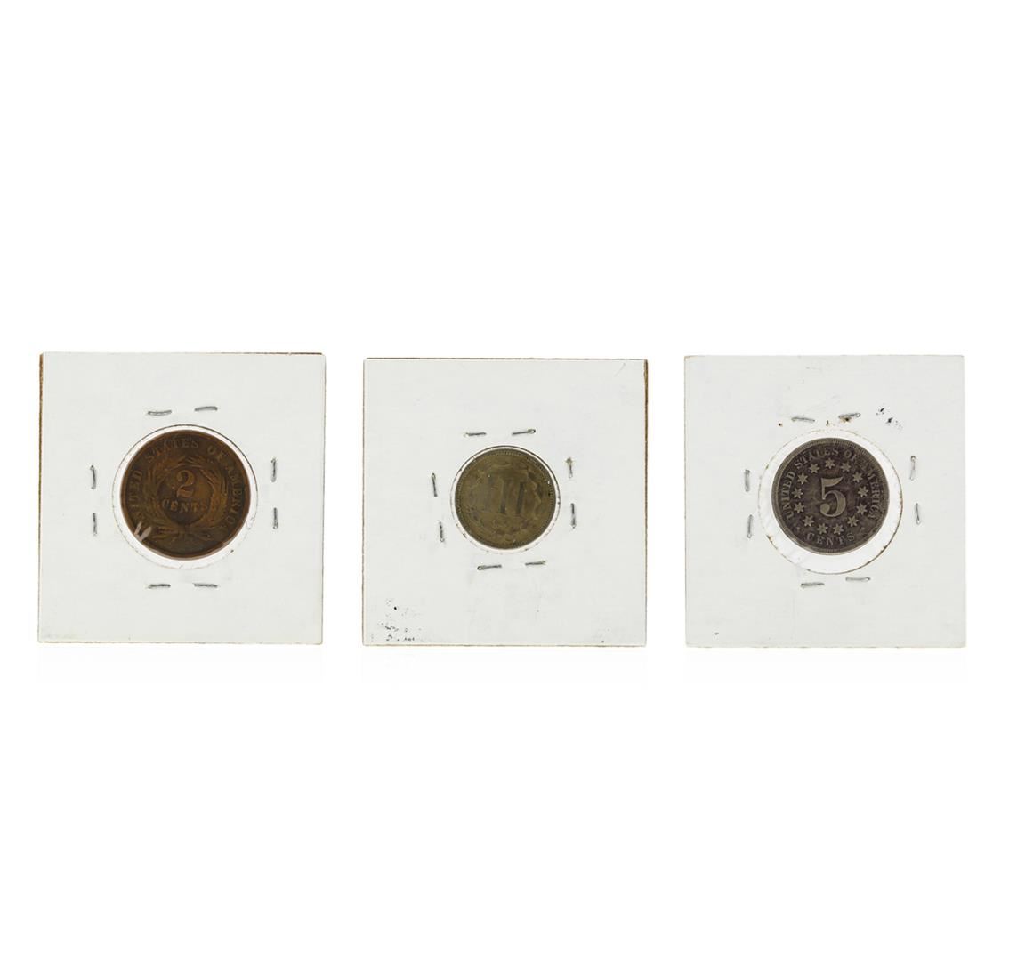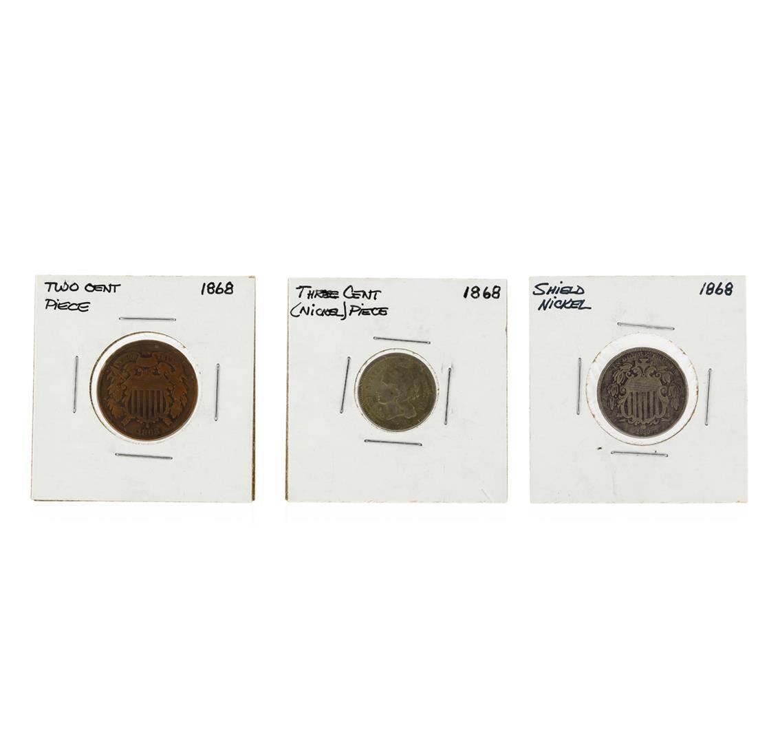 1868 2 Cent Piece, 3 Cent Nickel, and 5 Cent Shield Nickel Coin set