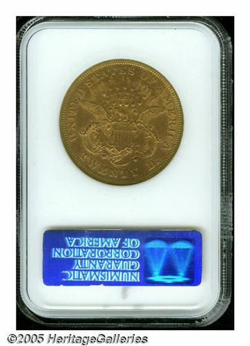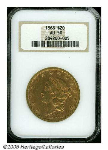 <B>1868<$20> AU50 NGC.</B></I> A boldly struck golden-brown example with distributed minor marks and ample orange-tinged luster. The 18 in the date is repunched south, the 68 in the date is repunched north. A better date, since less than 100,000 pieces were struck.<BR><I>From The Stig Ericsson Collection.</B></I>