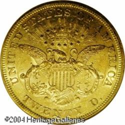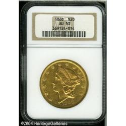 1868 $20 AU53 NGC. Lightly circulated and greatly <B>1868 $20 AU53 NGC.</B></I> Lightly circulated and greatly eye appealing with a bright overlay of yellow-gold patina that envelopes the surfaces. A scarce and highly desirable coin in all grades as only 98,600 of this type two Double Eagle were minted. <BR><BR><B>Important notice:</B> Heritage usually auctions material at the rate of 200-250 lots per hour. On some occasions eBay Live bid software or the Internet may not be able to keep up with the pace of the auction. We recommend placing a realistic absentee bid now as insurance to avoid disappointment. Occasionally the auctioneer may eliminate or reject an eBay Live bid, and the auctioneer may also reopen a lot after the close of the eBay live bidding (usually because we missed an audience bid), and may reject your bid even if it shows you as the winning bidder. By bidding via eBay Live, you agree that Heritage may award the lot to another bidder at its sole discretion under the circumstances described above or any other reasonable circumstances. Since eBay bids are not shown to us until we open the lot on the floor, we treat those bids just like floor bids. In most cases the floor responds before the eBay bid is presented to us, due to Internet lag time, so for consistency we have made it a policy that floor bids are always considered first over tie eBay live bids. Also please note that all Heritage lots purchased through eBay Live carry a 20% Buyer's Premium. Please make sure you read the Terms and Conditions before you bid. This lot is being auctioned in conjunction with a live floor auction by Heritage Galleries & Auctioneers. All final auction and invoice information will be supplied by Heritage Galleries & Auctioneers, and all other information should be considered preliminary. Lot:6861