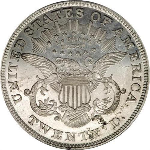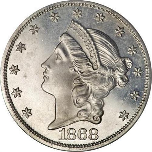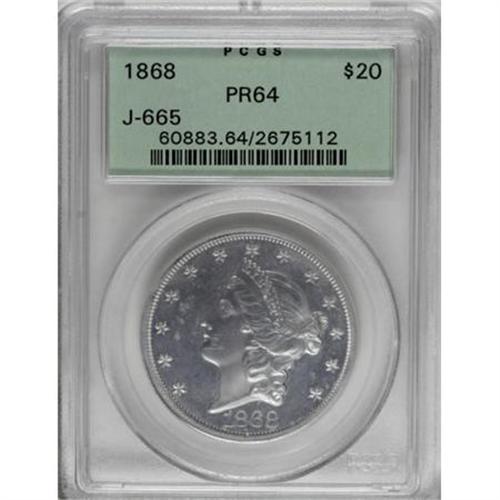<B>1868 $20 Twenty Dollar, Judd-665, Pollock-740, Low R.7, PR64 PCGS.</B></I> Regular issue design for the Liberty double eagle. Struck in aluminum with a reeded edge. Approximately six examples of this pattern are known, including those that were or are part of cased aluminum coinage sets. Four pieces were mentioned by Andrew Pollock III, including the Bass, Garrett, and Farouk coins and one that was offered in Bowers and Merena's September 1984 sale. This particular example has attractive light gray surfaces with reflective fields. A small mark is visible on Liberty's chin, and a few small planchet imperfections are evident on the reverse, which should be useful for pedigree purposes.<BR><BR><b>Shipping:</b> Coins & Currency (<a target="_blank" href="http://www.heritageauctions.com/common/shipping.php">view shipping information</a>)