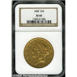 <B>1868 $20 XF45 NGC.</B></I> A scarce, low mintage issue with only 98,575 business strikes produced in the third year of the Type Two design. Surviving examples are usually VF or XF. This bright piece has a good portion of luster remaining and is well struck with small abrasions peppered across each side. Attractive deep coloration, as well.
