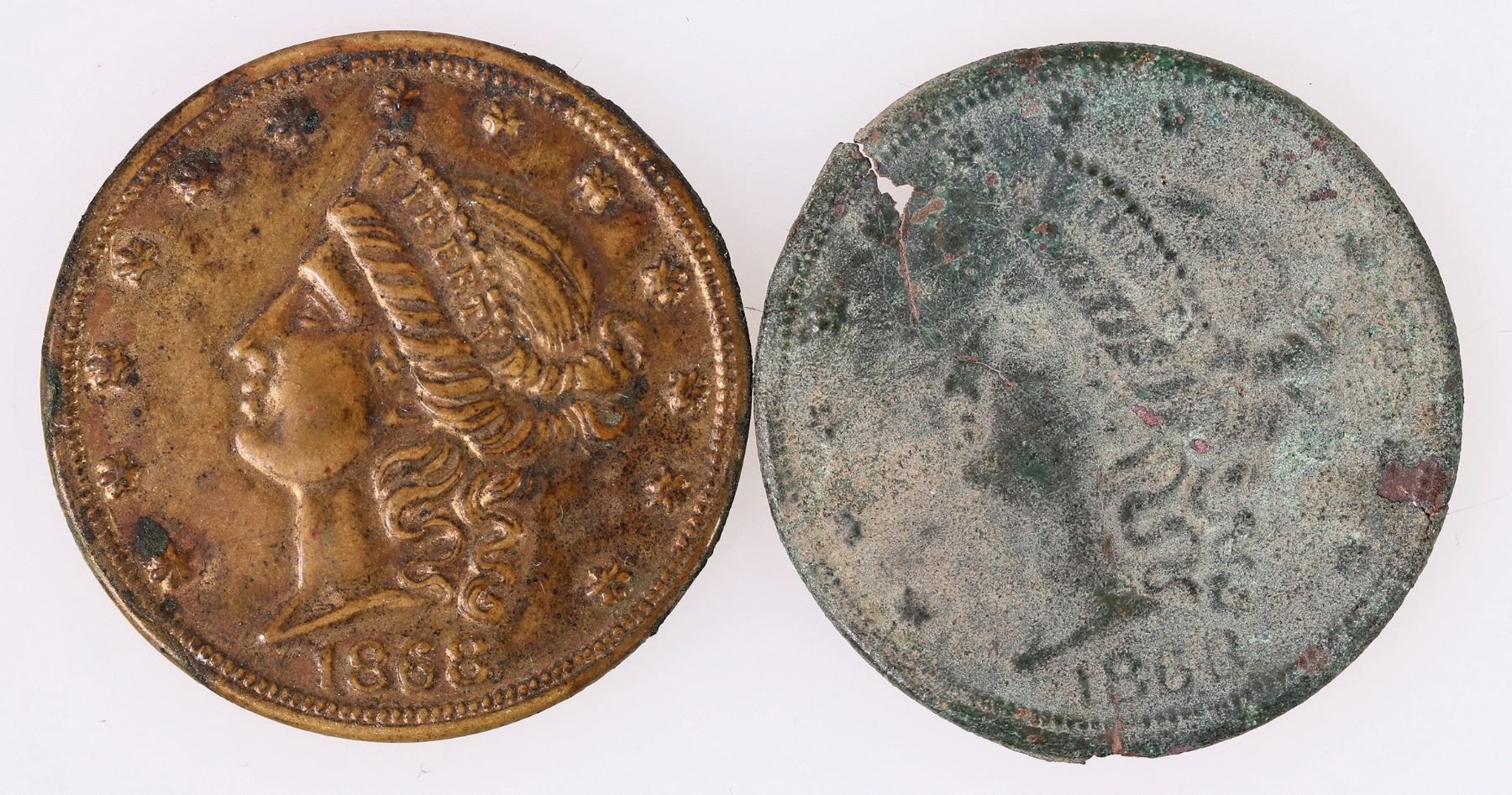 A dug pair of obverse only shell cards dated 1868, Liberty head. This pattern of obverse is very common, see Dave Bowers' book on American shell cards, available through TAMS. Since these were found in California, they could be western origin, but the design is far too common to tell.