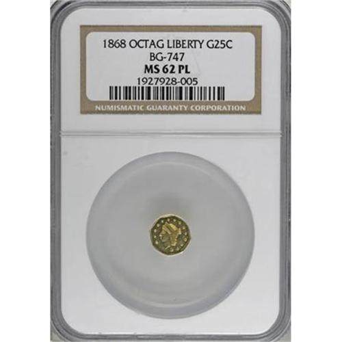 <B>1868 25C Liberty Octagonal 25 Cents, BG-747, High R.5, MS62 Prooflike NGC.</B></I> Nicely frosted devices contrast with the reflective fields. A few delicate hairlines decide the grade. As diagnostic for the variety, the reverse die has been lapped, removing portions of the letters and wreath bow. Census: 2 in 62 Prooflike, 2 finer (9/07).<BR><BR><b>Shipping:</b> Coins & Currency (<a target="_blank" href="http://www.heritageauctions.com/common/shipping.php">view shipping information</a>)