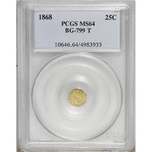 <B>1868 25C Indian Octagonal 25 Cents, BG-799T, High R.5, MS64 PCGS.</B></I> PCGS Population (14/4). NGC Census: (0/2). (#10646)<BR><BR><b>Shipping:</b> Coins & Currency (<a target="_blank" href="http://www.heritageauctions.com/common/shipping.php">view shipping information</a>)