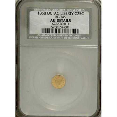 <B>1868 25C Liberty Octagonal 25 Cents, BG-745, Low R.6,--Scratched--NCS. AU Details.</B></I> NGC Census: (0/1). PCGS Population (0/28). (#10572)<BR><BR><b>Shipping:</b> Coins & Currency (<a target="_blank" href="http://www.heritageauctions.com/common/shipping.php">view shipping information</a>)