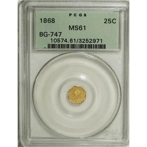 <B>1868 25C Liberty Octagonal 25 Cents, BG-747, High R.5, MS61 PCGS.</B></I> PCGS Population (8/11). NGC Census: (0/4). (#10574)<BR><BR><b>Shipping:</b> Coins & Currency (<a target="_blank" href="http://www.heritageauctions.com/common/shipping.php">view shipping information</a>)