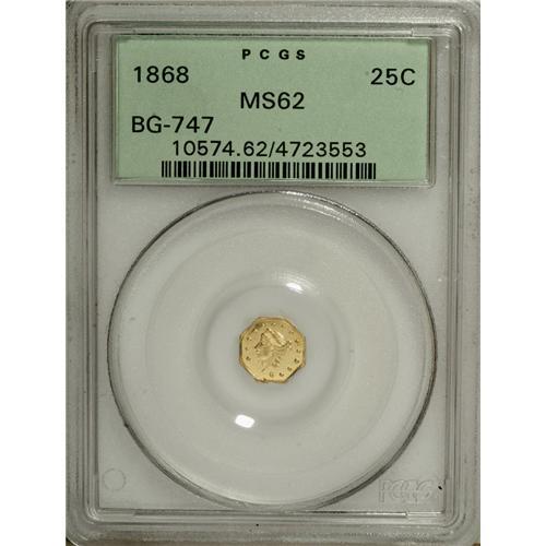 <B>1868 25C Liberty Octagonal 25 Cents, BG-747, High R.5, MS62 PCGS.</B></I> PCGS Population (9/2). NGC Census: (1/2). (#10574)<BR><BR><b>Shipping:</b> Coins & Currency (<a target="_blank" href="http://www.heritageauctions.com/common/shipping.php">view shipping information</a>)