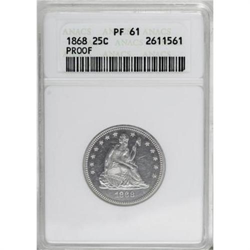 <B>1868 25C PR61 ANACS.</B></I> NGC Census: (6/107). PCGS Population (12/124). Mintage: 600. Numismedia Wsl. Price for NGC/PCGS coin in PR61: $292. (#5567)<BR><BR><B>Coin Engraver:</B> Christian Gobrecht<BR><BR><b>Shipping:</b> Coins & Currency (<a target="_blank" href="http://www.heritageauctions.com/common/shipping.php">view shipping information</a>)