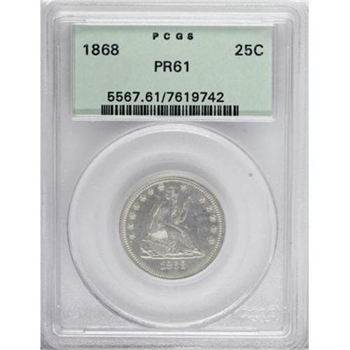 <B>1868 25C PR61 PCGS.</B></I> PCGS Population (12/120). NGC Census: (6/103). Mintage: 600. Numismedia Wsl. Price for NGC/PCGS coin in PR61: $292. (#5567)<BR><BR><b>Shipping:</b> Coins & Currency (<a target="_blank" href="http://www.heritageauctions.com/common/shipping.php">view shipping information</a>)