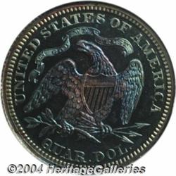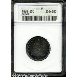 <B>1868<25C> PR65 ANACS.</B></I> Briggs 2-B. This obverse die, which was used exclusively for proofs of this date, displays triple punching on the first digit in the date and light recutting inside the upper loop of the final 8. There is also a die break (as struck) on the scroll between the ER in LIBERTY, and a lump (also as produced) attached to the scroll at the bottom on the letter B. The latter two are curious features for a proof die, but, nonetheless, they make it easy for one to distinguish between proofs and business strikes of the 1868 Quarter.<BR> This specimen striking displays razor-sharp definition in all areas. Fully struck and free of bothersome contact marks, with bright, highly reflective fields. <BR><BR><B>Important notice:</B> Heritage usually auctions material at the rate of 200-250 lots per hour. On some occasions eBay Live bid software or the Internet may not be able to keep up with the pace of the auction. We recommend placing a realistic absentee bid now as insurance to avoid disappointment. Occasionally the auctioneer may eliminate or reject an eBay Live bid, and the auctioneer may also reopen a lot after the close of the eBay live bidding (usually because we missed an audience bid), and may reject your bid even if it shows you as the winning bidder. By bidding via eBay Live, you agree that Heritage may award the lot to another bidder at its sole discretion under the circumstances described above or any other reasonable circumstances. Since eBay bids are not shown to us until we open the lot on the floor, we treat those bids just like floor bids. In most cases the floor responds before the eBay bid is presented to us, due to Internet lag time, so for consistency we have made it a policy that floor bids are always considered first over tie eBay live bids. Also please note that all Heritage lots purchased through eBay Live carry a 20% Buyer's Premium. Please make sure you read the Terms and Conditions before you bid. </span></font></tr></table></td></tr></table>