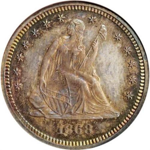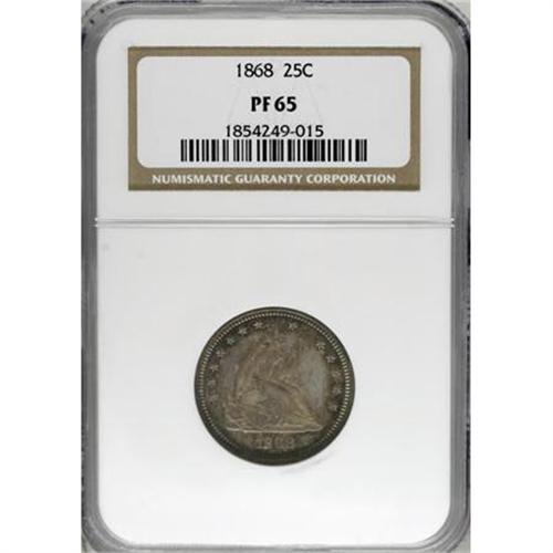 <B>1868 25C PR65 NGC.</B></I> The proof quarter mintage of 1868 amounted to just 600 specimens, and of the pieces extant today, few have the incredible eye appeal of this beautifully toned piece. The obverse has an orange center with bands of blue and emerald near the rims, while the reverse has a blend of rose, violet, and sapphire patina. Crisply struck with well-preserved surfaces. Census: 12 in 65, 10 finer (6/07).<BR><BR><B>Coin Engraver:</B> Christian Gobrecht<BR><BR><b>Shipping:</b> Coins & Currency (<a target="_blank" href="http://www.heritageauctions.com/common/shipping.php">view shipping information</a>\)