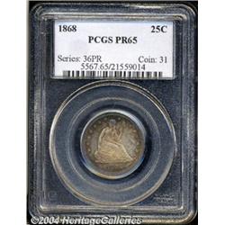 <B>1868<25C> PR65 PCGS.</B></I> An array of breathtaking iridescent hues spray outward from well preserved mirrors. One of very few Gems surviving from an original mintage of 600 proofs. Population: 8 in 65, 1 finer (3/04). <BR><BR><B>Important notice:</B> Heritage usually auctions material at the rate of 200-250 lots per hour. On some occasions eBay Live bid software or the Internet may not be able to keep up with the pace of the auction. We recommend placing a realistic absentee bid now as insurance to avoid disappointment. Occasionally the auctioneer may eliminate or reject an eBay Live bid, and the auctioneer may also reopen a lot after the close of the eBay live bidding (usually because we missed an audience bid), and may reject your bid even if it shows you as the winning bidder. By bidding via eBay Live, you agree that Heritage may award the lot to another bidder at its sole discretion under the circumstances described above or any other reasonable circumstances. Since eBay bids are not shown to us until we open the lot on the floor, we treat those bids just like floor bids. In most cases the floor responds before the eBay bid is presented to us, due to Internet lag time, so for consistency we have made it a policy that floor bids are always considered first over tie eBay live bids. Also please note that all Heritage lots purchased through eBay Live carry a 20% Buyer's Premium. Please make sure you read the Terms and Conditions before you bid.