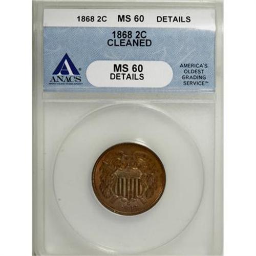 <B>1868 2C Brown--Cleaned--ANACS. MS60 Details.</B></I> NGC Census: (0/161). PCGS Population (1/67). Mintage: 2,803,750. Numismedia Wsl. Price for NGC/PCGS coin in MS60: $105. (#3597)<BR><BR><B>Coin Engraver:</B> James B. Longacre<BR><BR><b>Shipping:</b> Coins & Currency (<a target="_blank" href="http://www.heritageauctions.com/common/shipping.php">view shipping information</a>)