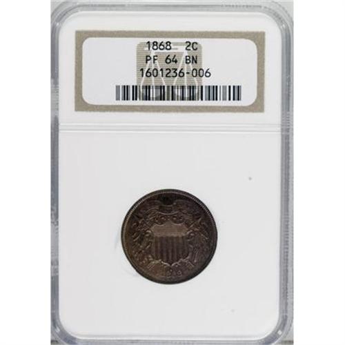 <B>1868 2C PR64 Brown NGC.</B></I> NGC Census: (4/12). PCGS Population (7/5). Mintage: 600. Numismedia Wsl. Price for NGC/PCGS coin in PR64: $415. (#3636)<BR><BR><b>Shipping:</b> Coins & Currency (<a target="_blank" href="http://www.heritageauctions.com/common/shipping.php">view shipping information</a>)
