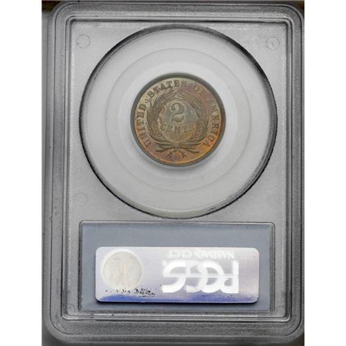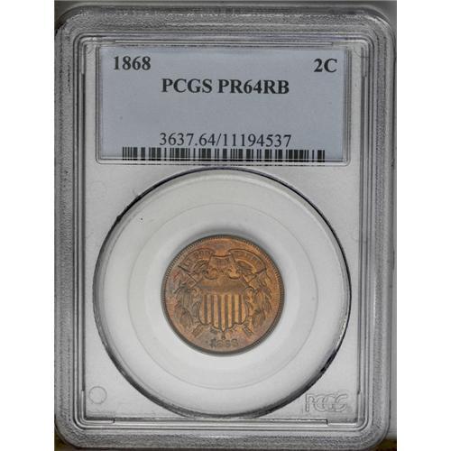 <B>1868<2C> PR64 Red and Brown PCGS.</B></I> Rich copper-red toning on the obverse and near the reverse borders yields to lighter gray-green patina near the reverse center. Well struck and essentially problem-free, although with somewhat muted reflectivity in the fields. Population: 76 in 64, 38 finer (6/06).