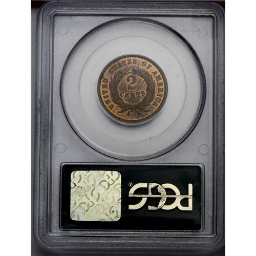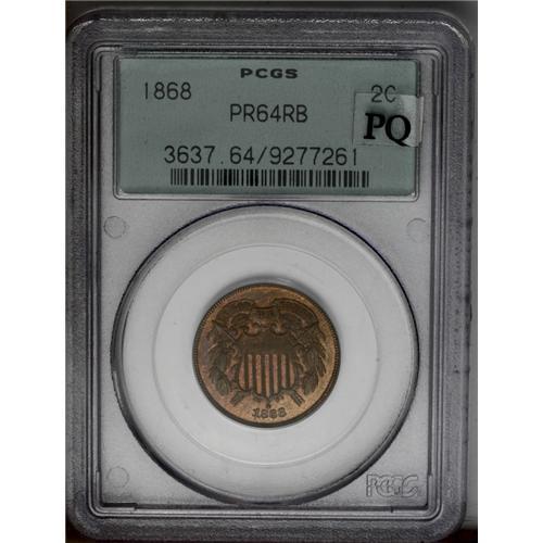<B>1868<2C> PR64 Red and Brown PCGS.</B></I> This precisely struck example has a gold and champagne-rose obverse that approaches full Red. The reverse is divided between luminous orange and mauve-lilac. The 68 in the date is lightly repunched. Housed in an older generation holder.
