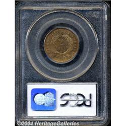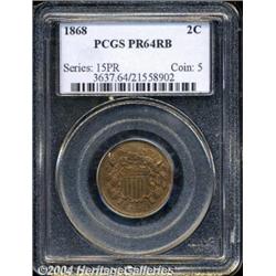 <B>1868<2C> PR64 Red and Brown PCGS.</B></I> A boldly struck and unmarked near-Gem with rich gold, tan, and sea-green colors. The <I>Guide Book</B></I> reports a mintage of 600+ pieces, and the low certified populations confirm such a low production. The date is lightly repunched. <BR><BR><B>Important notice:</B> Heritage usually auctions material at the rate of 200-250 lots per hour. On some occasions eBay Live bid software or the Internet may not be able to keep up with the pace of the auction. We recommend placing a realistic absentee bid now as insurance to avoid disappointment. Occasionally the auctioneer may eliminate or reject an eBay Live bid, and the auctioneer may also reopen a lot after the close of the eBay live bidding (usually because we missed an audience bid), and may reject your bid even if it shows you as the winning bidder. By bidding via eBay Live, you agree that Heritage may award the lot to another bidder at its sole discretion under the circumstances described above or any other reasonable circumstances. Since eBay bids are not shown to us until we open the lot on the floor, we treat those bids just like floor bids. In most cases the floor responds before the eBay bid is presented to us, due to Internet lag time, so for consistency we have made it a policy that floor bids are always considered first over tie eBay live bids. Also please note that all Heritage lots purchased through eBay Live carry a 20% Buyer's Premium. Please make sure you read the Terms and Conditions before you bid.