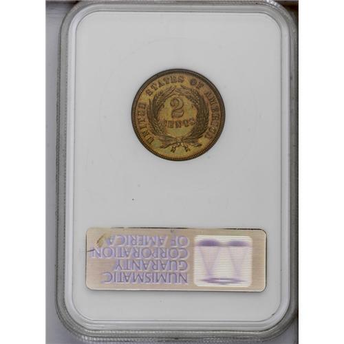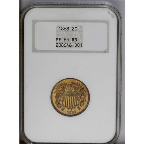 <B>1868<2C> PR65 Red and Brown NGC.</B></I> The vibrant copper-orange color on the obverse mellows somewhat on the reverse. This boldly struck Gem is housed in an early holder.