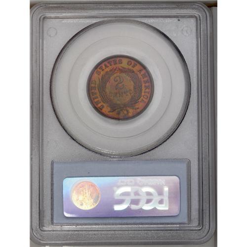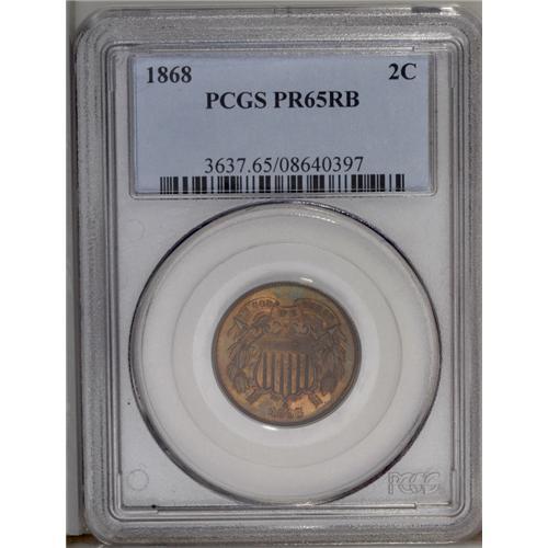 <B>1868<2C> PR65 Red and Brown PCGS.</B></I> The reddish-orange surfaces have mellowed somewhat, but the exquisite strike and still-reflective mirrors establish this coin as thoroughly proof. A Gem with solid eye appeal.