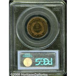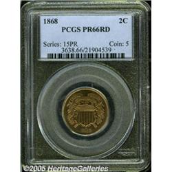 <B>1868 2C PR66 Red PCGS.</B></I> Virtually flawless fields display deep, watery mirrors and a lovely copper-gold color that lies uniformly across the surfaces. Red proof copper is such an underestimated rarity--this issue boasts only nine pieces graded PR66 Red by PCGS with two finer (2/05).