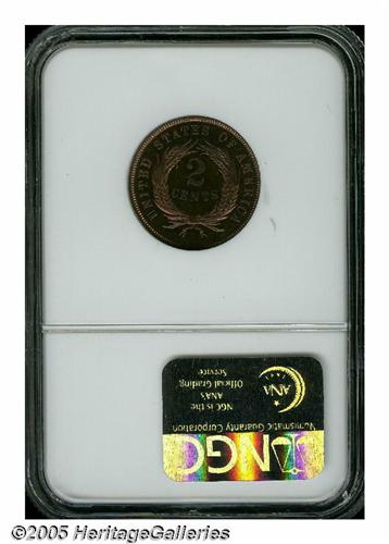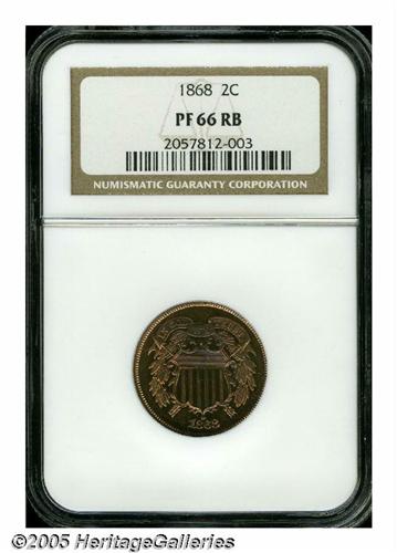 <B>1868<2C> PR66 Red and Brown NGC.</B></I> The elusiveness of this issue at the Premium Gem and higher level with Red and Brown color designation is to some degree apparent from the population figures. NGC and PCGS have certified a total of 26 pieces, with just four rating higher (3/05). Likewise, the major auction houses, according to our records, have had only six appearances of such coins over the last ten years, with none grading finer. This particular specimen displays an exceptionally sharp strike, and a very pleasing blend of golden-tan and violet patina. The surfaces are virtually pristine, and exhibit nice contrast between the devices and mirrored fields. This coin generates outstanding eye appeal.