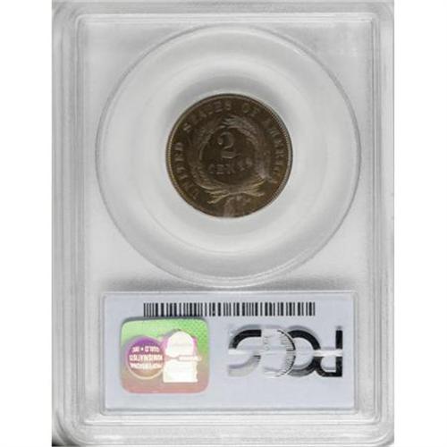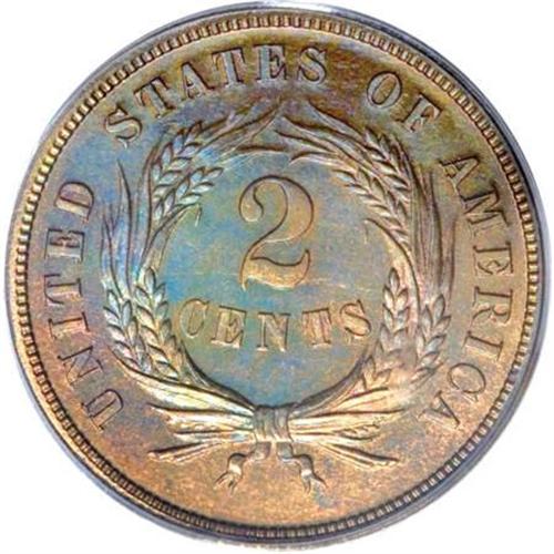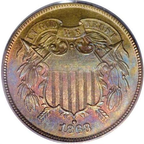 <B>1868 2C PR66 Red and Brown PCGS.</B></I> Ex: Eliasberg Collection. Sharply struck, this attractive Premium Gem displays the typical rich coloration of its type, in variations of blue, tan, and magenta, along with moderate reflectivity from the proof fields. Diagonal die striations reside between the vertical shield lines, and there are no visible spots on either side. Population: 5 in 66 Red and Brown, just one is finer in the same color, at PCGS (11/07).<BR><BR><B>Coin Engraver:</B> James B. Longacre<BR><BR><b>Shipping:</b> Coins & Currency (<a target="_blank" href="http://www.heritageauctions.com/common/shipping.php">view shipping information</a>)