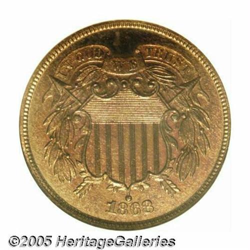 <B>1868<2C> PR67 Red and Brown NGC.</B></I> The fields have deep, glassy, mirrored reflectivity and both sides are mostly red with a splash of crimson at the centers. Spot-free, mark-free and of Superb quality overall, this is one of the finest examples thus far certified by either service. Population: 3 in 67 Red and Brown, 0 finer (3/05).
